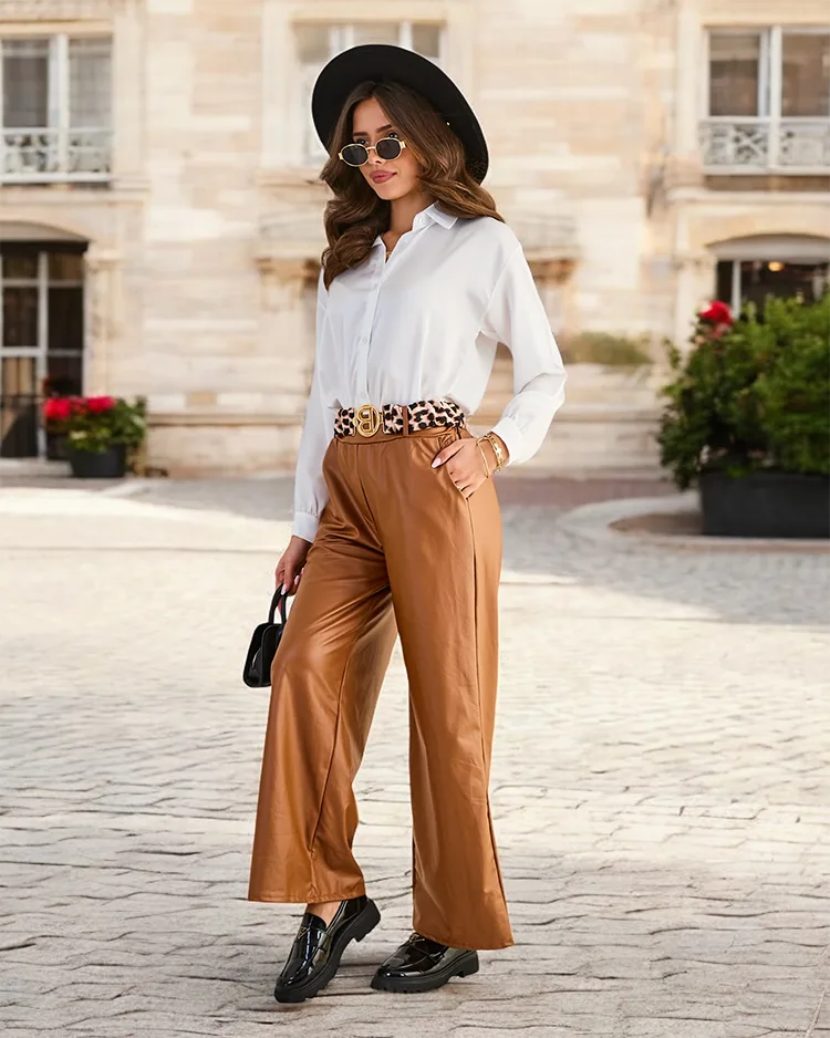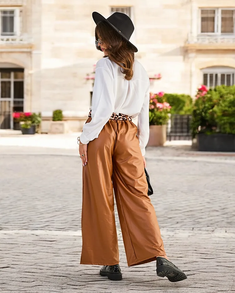 - Стильні широкі жіночі штани, виготовлені з екошкіри. Модель має еластичний пояс, 2 кишені та додатковий ремінь в комплекті. Хіт сезону! УВАГА: Точність вимірювань (+/-) 1 см.
