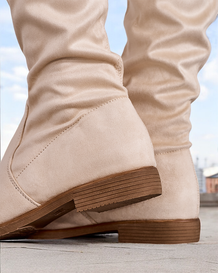- Стильні жіночі взуття до коліна з плоскою підошвою. Верх виготовлений з еко замші, всередині є еко шкіряна устілка. Модель без шнурування з манжетою у верхній частині кронштейна. Ідеально підходить для повсякденних осінніх образів!
