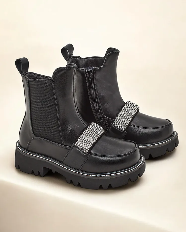 - Чудові чоботи для дівчат на плоскій підошві, виготовлені з екошкіри. Всередині взуття покрито м'яким, приємним на дотик хутром. Модель має ненав'язливу прикрасу на верхі. запірна блискавка.