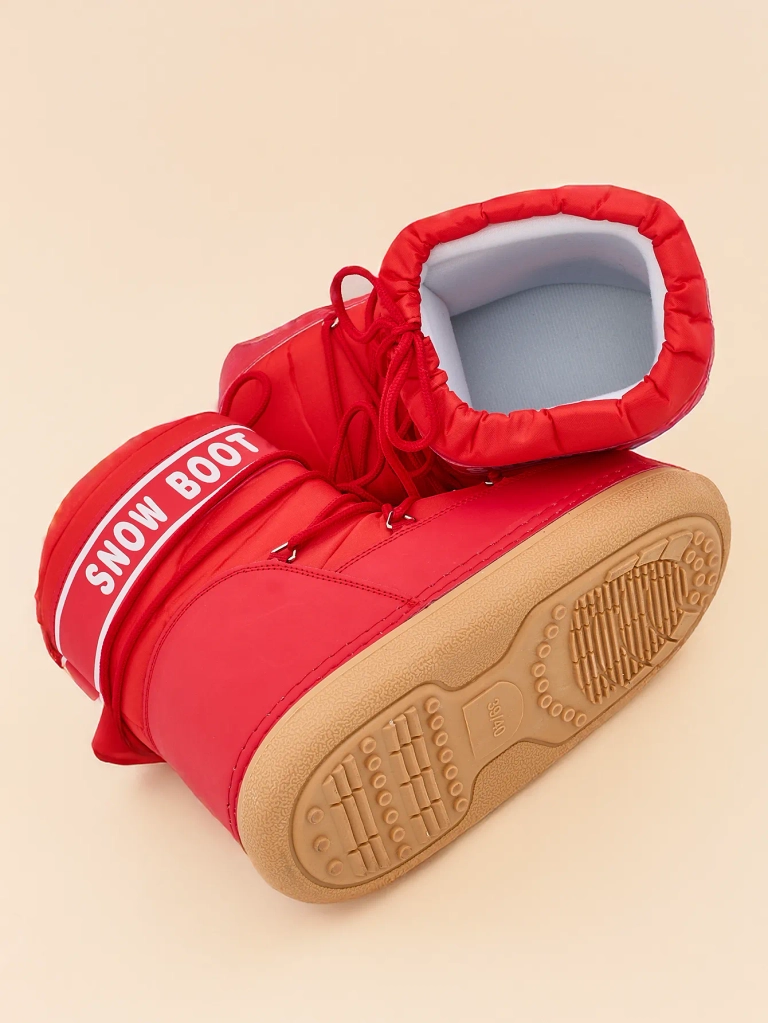 - Жіночі сніжні чоботи з манжетою з комбінації еко-шкіри та матеріалу з тканини з квільтованим малюнком. Підкладка з тканини всередині, шнурівка і взутий тип, має манжету.