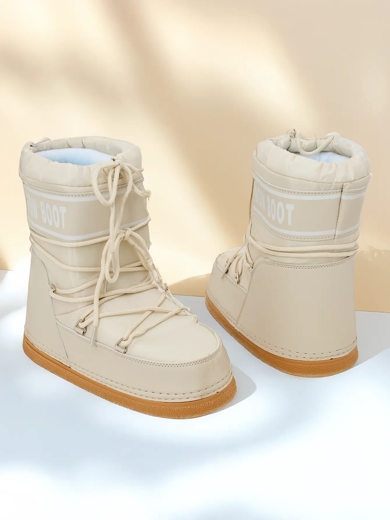 - Жіночі сніжні чоботи з манжетою з комбінації еко-шкіри та матеріалу з тканини з квільтованим малюнком. Підкладка з тканини всередині, шнурівка і взутий тип, має манжету.