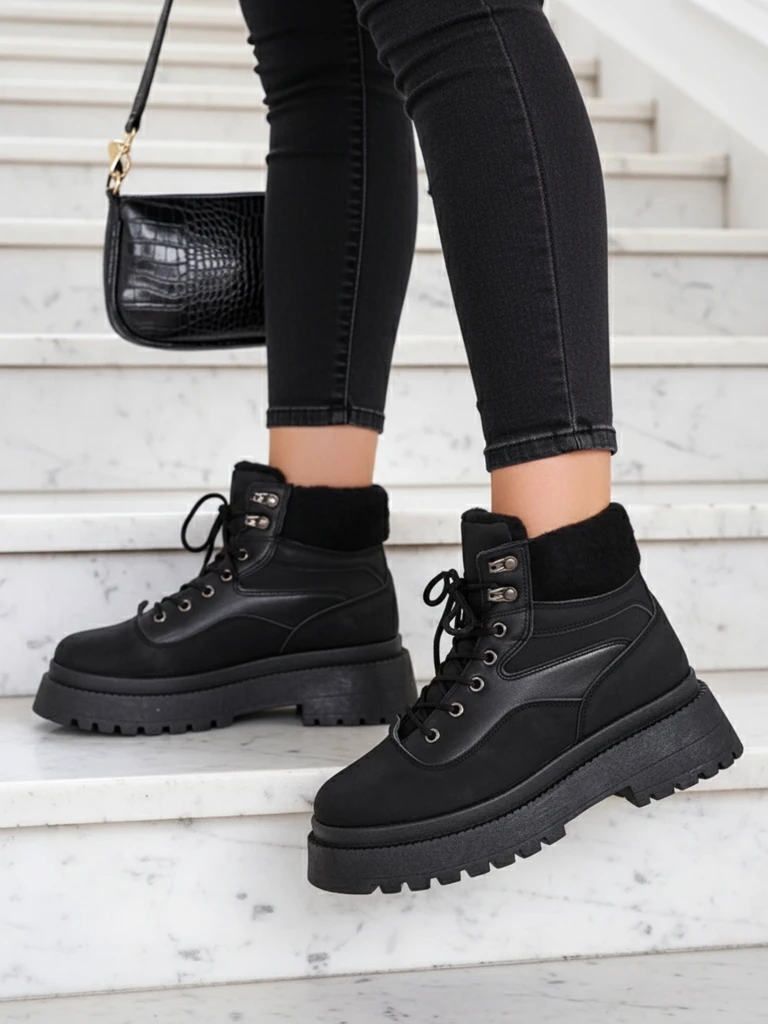 • Класичні жіночі сніжні чоботи з товстими підошвами. Верх виготовлений з штучної шкіри. Всередині відстібний підклад у вигляді штучного хутра, чоботи на шнурках. Ідеально підходить для прохолодного сезону!