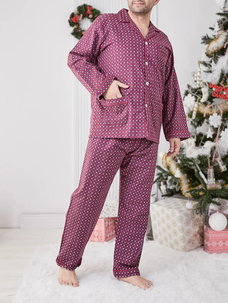 • Чоловічі піжами з модним принтом, виготовлені з бавовняного матеріалу. Модель має довгі рукави та штани. Верх застібається на гудзики. Комфорт та елегантність в одному виконанні!
