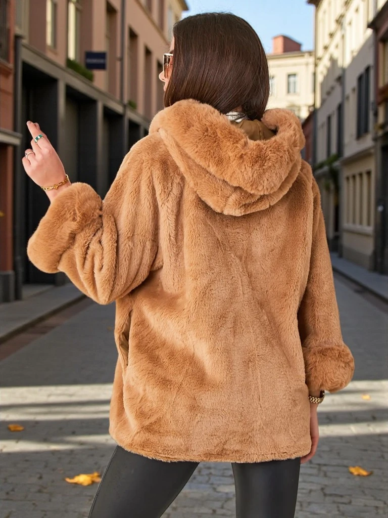 - Виняткове жіноче пальто з приємного, м'якого матеріалу, схожого на штучне хутро. Модель має капюшон, 2 кишені та застібку на блискавці. Хіт цього сезону!