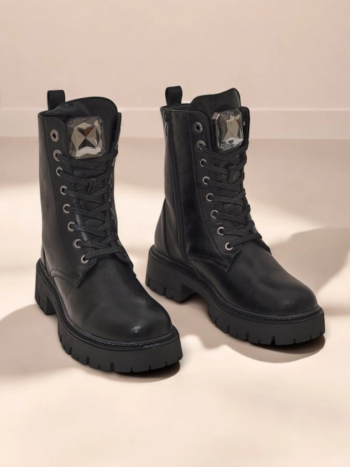 • Жіночі чоботи типу робітниці - це унікальне взуття, поєднуюче стиль і комфорт. Взуття виготовлене з екологічної шкіри та тканини внутрішній устілкою. Модель з зав'язками та застібкою-блискавкою.