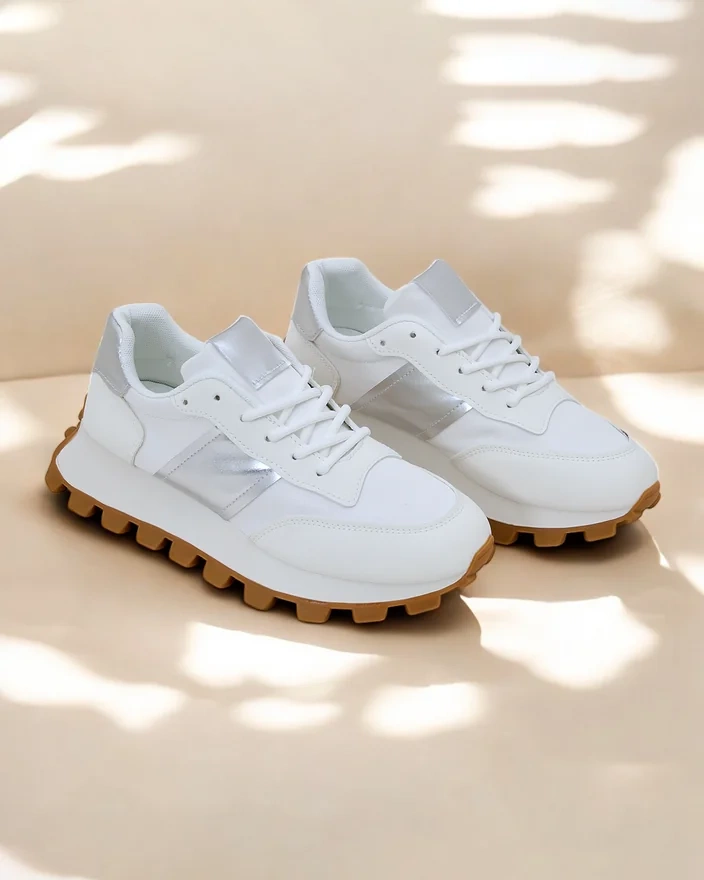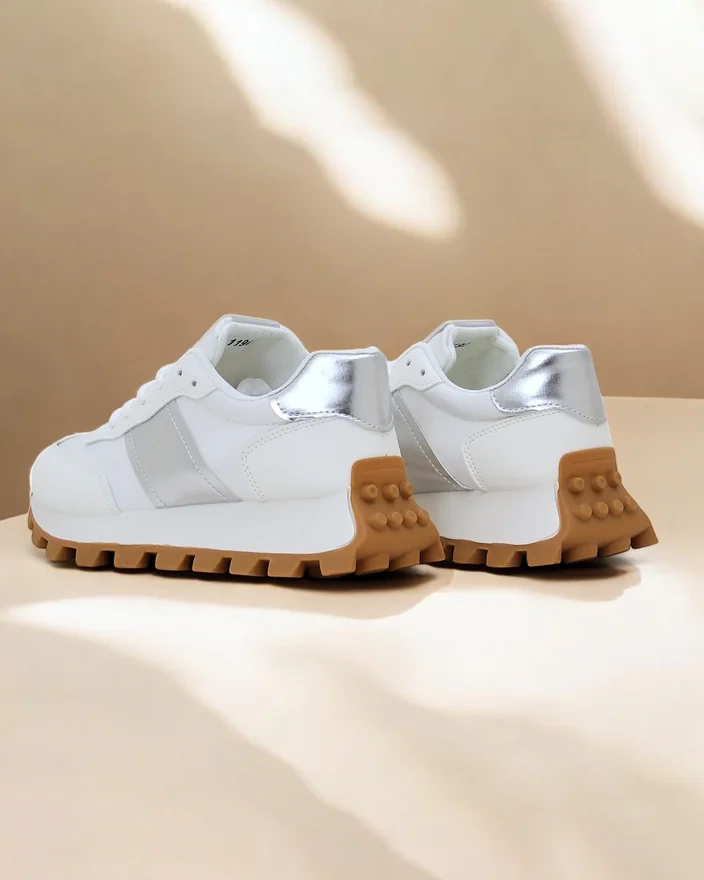 - Жіночі кросівки з плоскою підошвою, виготовлені з поєднання блискучої еко-шкіри, екологічного нубуку та тканинних елементів, є ідеальним поєднанням стилю та комфорту. Модель має тканинну устілку. Ідеально підходять для активних людей!