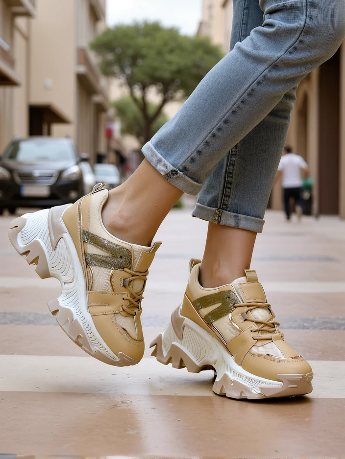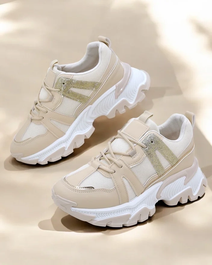 • Жіночі платформені кросівки. Взуття виготовлено з еко-шкіри з блискучими вставками та текстильною устілкою. Чудове доповнення до ваших повсякденних образів!