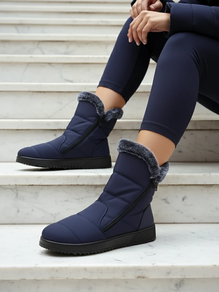 - Чудові зимові жіночі снігоступи з плоским каблуком. Верх виконаний з тканини, а всередині утеплений хутром. Модель має застібку на блискавці. Ідеальна основа для зими!