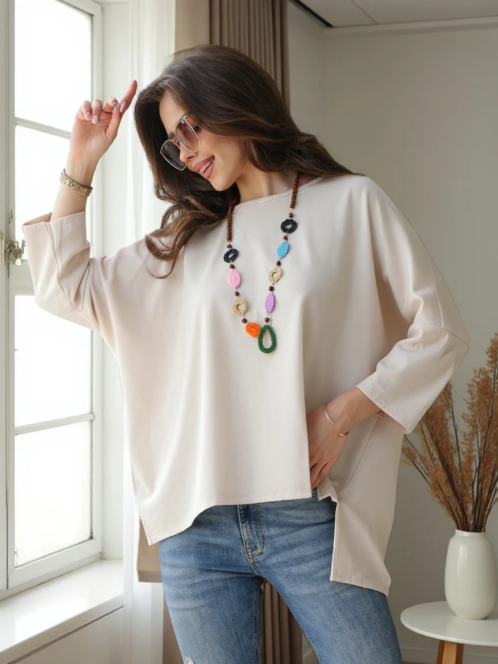 - Оригінальна жіноча блузка з круглим вирізом, виготовлена з приємної та м'якої тканини. Цей продукт має вільний крій і втачані рукави довжиною 3/4. Крім того, в комплекті є necklace. Ідеальний вибір для створення стильних образів!