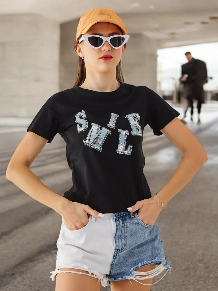 • Оригінальна жіноча блузка з круглим вирізом, виготовлена з м'якої та приємної на дотик тканини. Вся модель прикрашена стриманим написом, а короткі рукави надають легкості. Ідеальний вибір для створення модних та стильних образів!