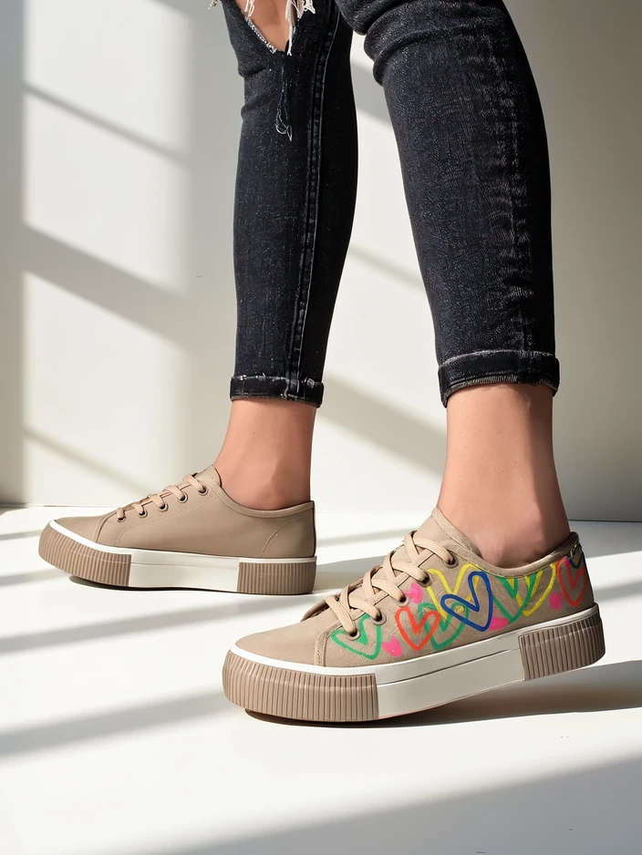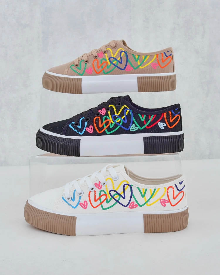 - жіночі кросівки, виготовлені з текстильного матеріалу. Верх — шнурівка, прикрашена принтом сердечок. Підошва — класична гумова. Ці черевики будуть відмінними для щоденного носіння!