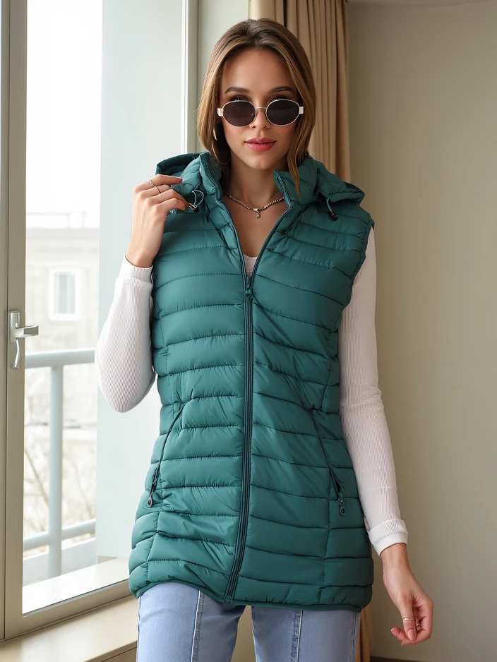 • Стильна жіноча безрукавка на блискавці, з двома практичними кишенями та відстібним капюшоном. Ідеальна посадка, м'яка синтетична підкладка гарантує комфорт і тепло в прохолодні дні.
