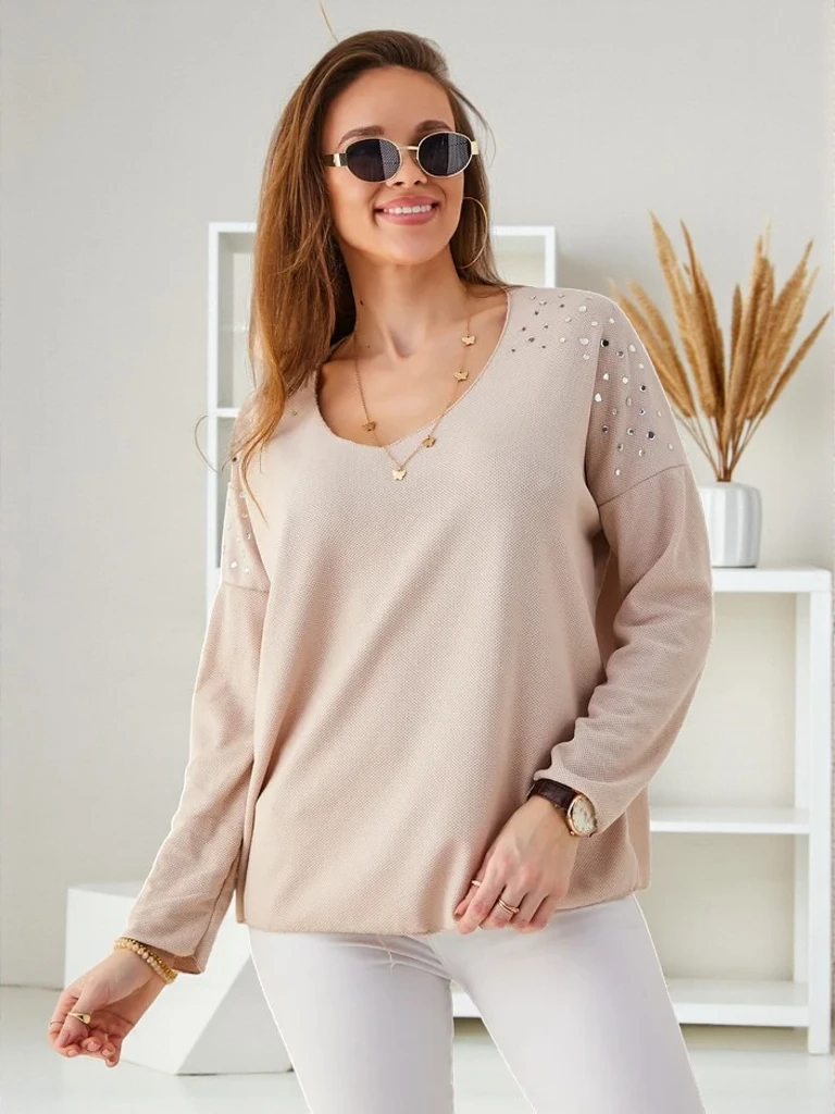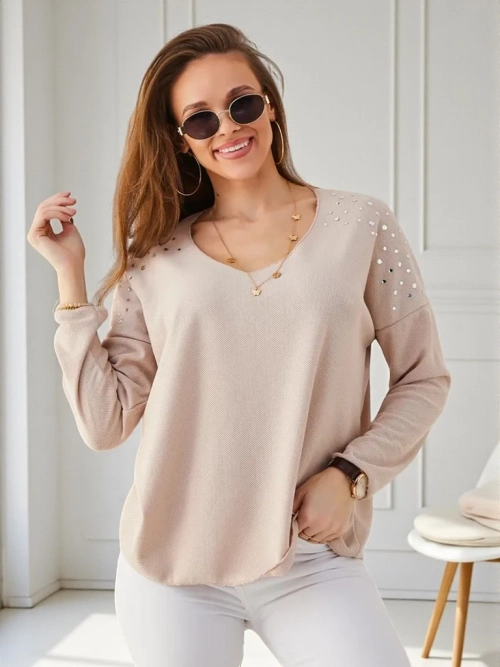 • Жіночий светр з V-подібним вирізом з приємної тканини. Модель має довгі рукава. Вона прикрашена стразами на плечах. Ідеальна база для зимових образів!
