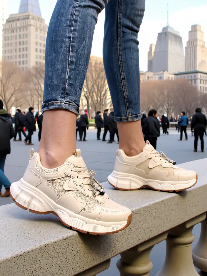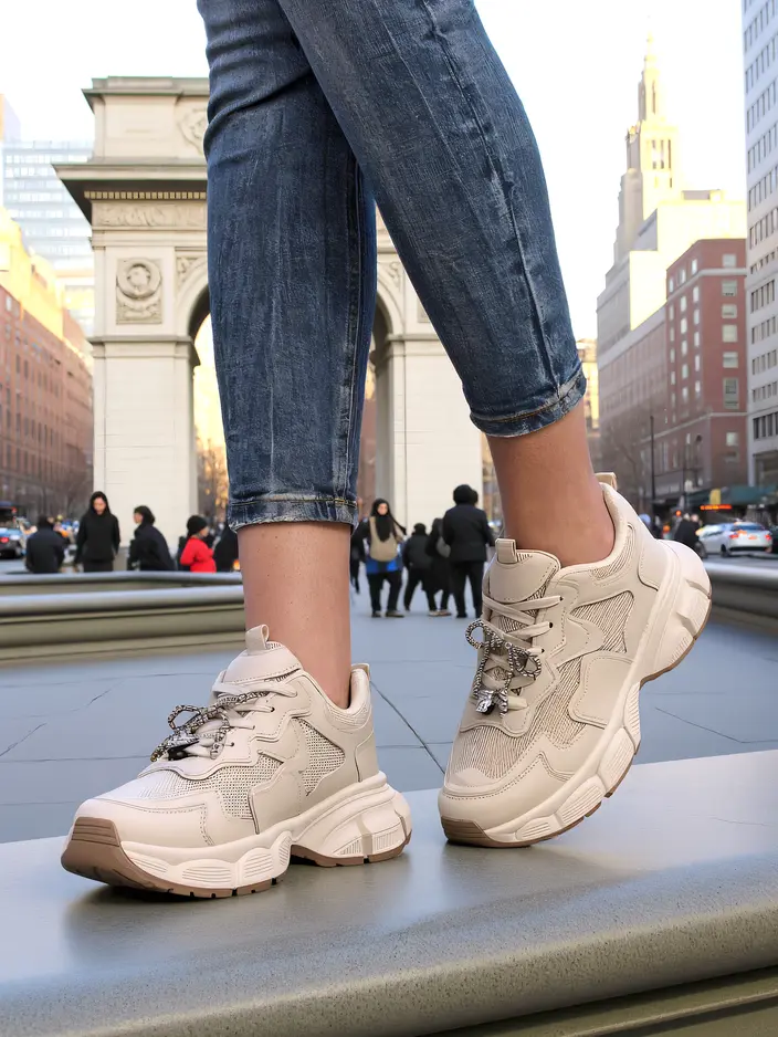 • Жіночі спортивні черевики, виготовлені з екологічної шкіри та мережива. Модель на товстій підошві. Шнурована верхня частина. Вони ідеально підходять для щоденних образів! Прикрашені знімним ланцюгом.