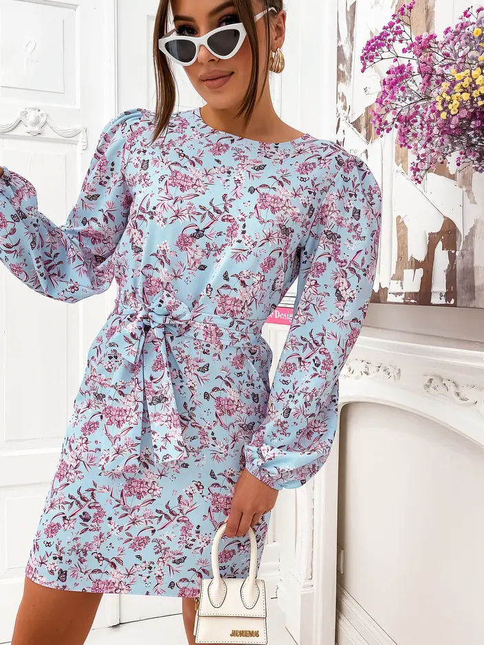 - Квіткове міні-сукня для жінок з об’ємними рукавами та поясом, виготовлена з легкого тканини. Модель з округлим вирізом, довгими рукавами та поясом, який підкреслює талію. Ідеально для сандалів! ЗНАЙТЕ: Точність вимірювань (+/-) 1 см.