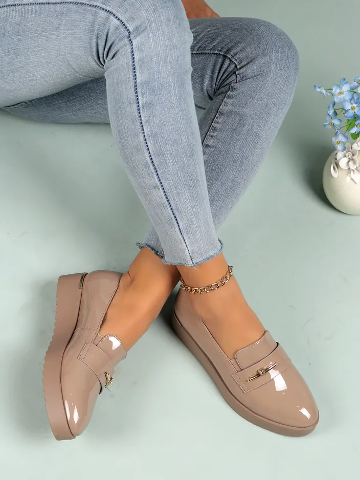 - Красиві жіночі мокасини на плоскій підошві. Модель має повсякденний стиль і виготовлена з патентної екошкіри та екошкіряної устілки. Носок закруглений. Ідеальна основа для багатьох повсякденних образів!