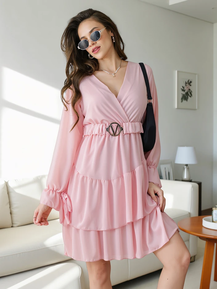 - Жіноча міні-сукня з рюшами. Модель з довгими рукавами, обгортковим вирізом і елasticом на талії. Обов'язковий елемент у вашому гардеробі!