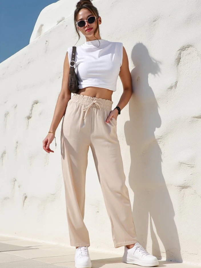 - Широкие брюки из легкой ткани, модель с эластичным поясом и двумя карманами. Удобно и уютно! ПРИМЕЧАНИЕ: Точность измерений (+/-) 1 см.