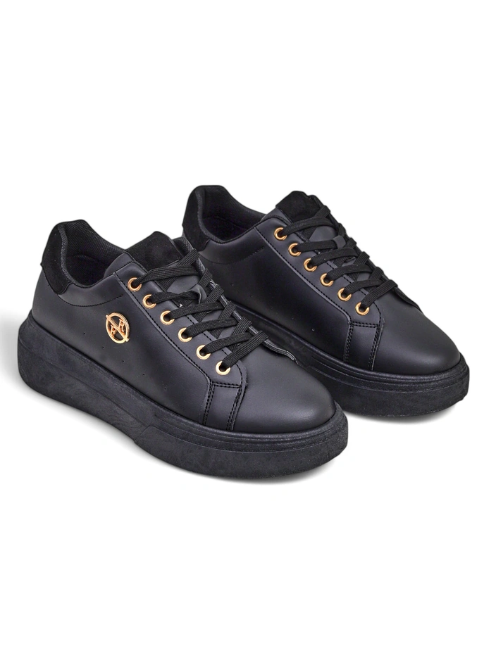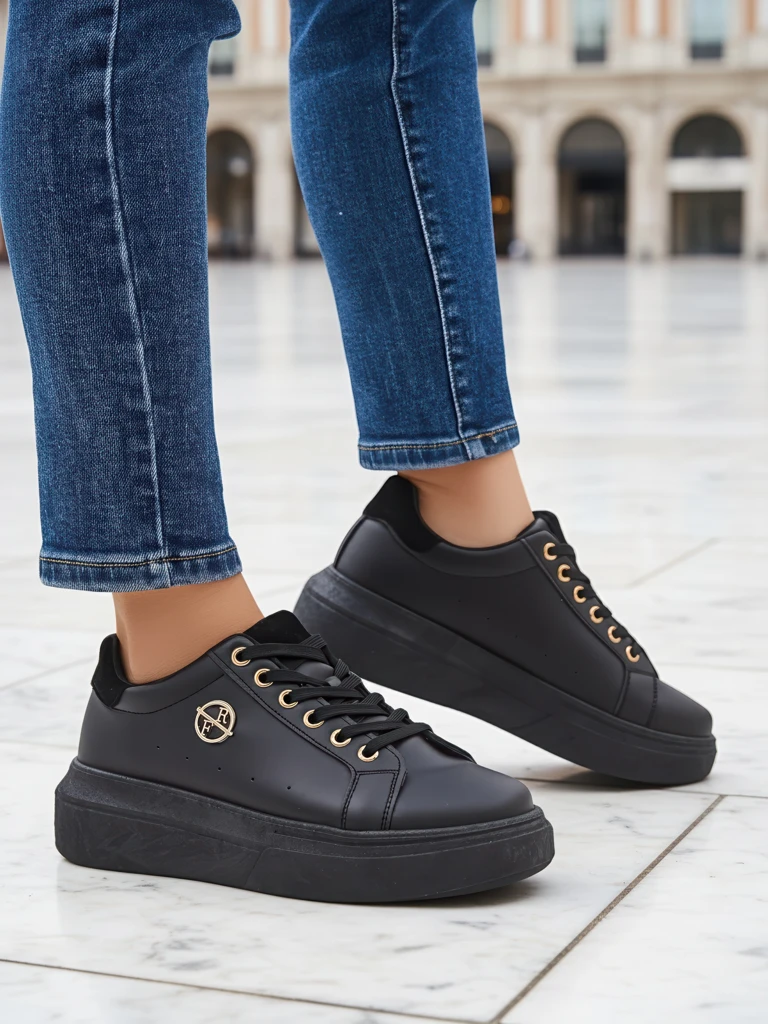 Відкрийте для себе снікерси Erato Nero – унікальне жіноче взуття на платформі, ідеальне на весну та для кожної жінки, яка цінує комфорт і стиль. Виготовлені з високоякісної екологічної шкіри, поєднаної з тканинною, дихаючою устілкою, вони гарантують комфорт протягом усього дня. Екологічна шкіра – це сучасний матеріал, який імітує натуральну шкіру, водночас поважаючи тварин. Процес виробництва матеріалу відповідає суворим нормам безпеки та екології, що підтверджується міжнародними галузевими сертифікатами (наприклад, OEKO-TEX, якщо доступні).Взуття Erato Nero вирізняється класичним чорним кольором, золотими деталями на шнурівці та логотипом, які додають елегантності кожній стилізації. Платформа висотою 5 см робить фігуру стрункішою, забезпечуючи стабільність і зручність завдяки відповідному профілю підошви та амортизуючій внутрішній частині. Новий стан взуття гарантує свіжість і найвищу якість виготовлення.Переваги носіння снікерсів Erato Nero – це не тільки зручність, але й універсальність – вони чудово підійдуть як для повсякденних, так і для більш елегантних образів. Делікатна тканина устілки захищає стопу від натирань, а легкість конструкції забезпечує комфорт під час тривалих прогулянок.3 ідеї для стилізації: 1. Casual look: комплект з джинсами, білою футболкою та курткою-бомбером – класика для міської прогулянки.2. Streetwear: поєднайте з широкими штанами карго та коротким топом – модний, молодіжний аутфіт.3. Елегантність на розслабленості: снікерси з чорною сукнею міді та оверсайз піджаком – стиль для офісу або зустрічі з друзями.Догляд: Екологічну шкіру чистіть вологою, м’якою тканиною або спеціальними препаратами, призначеними для цього типу матеріалу. Уникайте тривалого контакту з водою та прямої дії сонячних променів, щоб не допустити знебарвлення. Зберігайте взуття в провітрюваному місці, найкраще в оригінальній коробці або на полиці.Тренди: Снікерси на високій платформі – це зараз один з найсильніших трендів у вуличній моді. Завдяки універсальному кольору та сучасній лінії Erato Nero чудово вписуються в актуальний модний клімат, дозволяючи вільно міксувати їх у багатьох весняних стилізаціях.