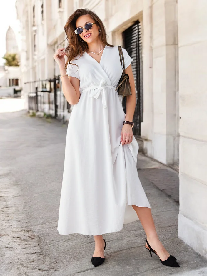 Royalfashion Жіноча міді-сукня з об'ємним вирізом, короткими рукавами та поясом