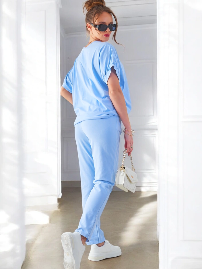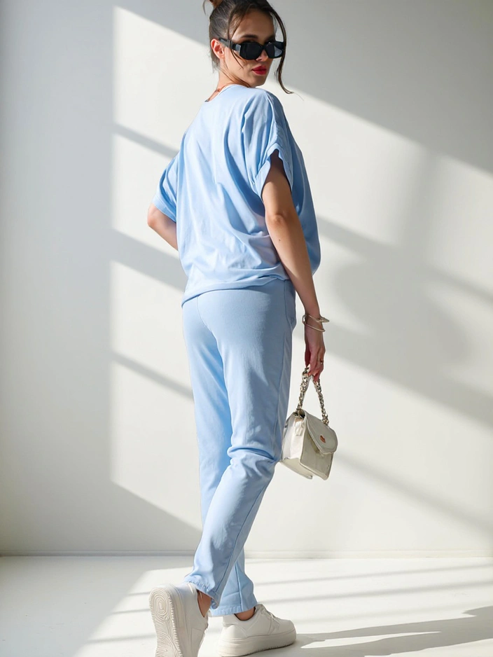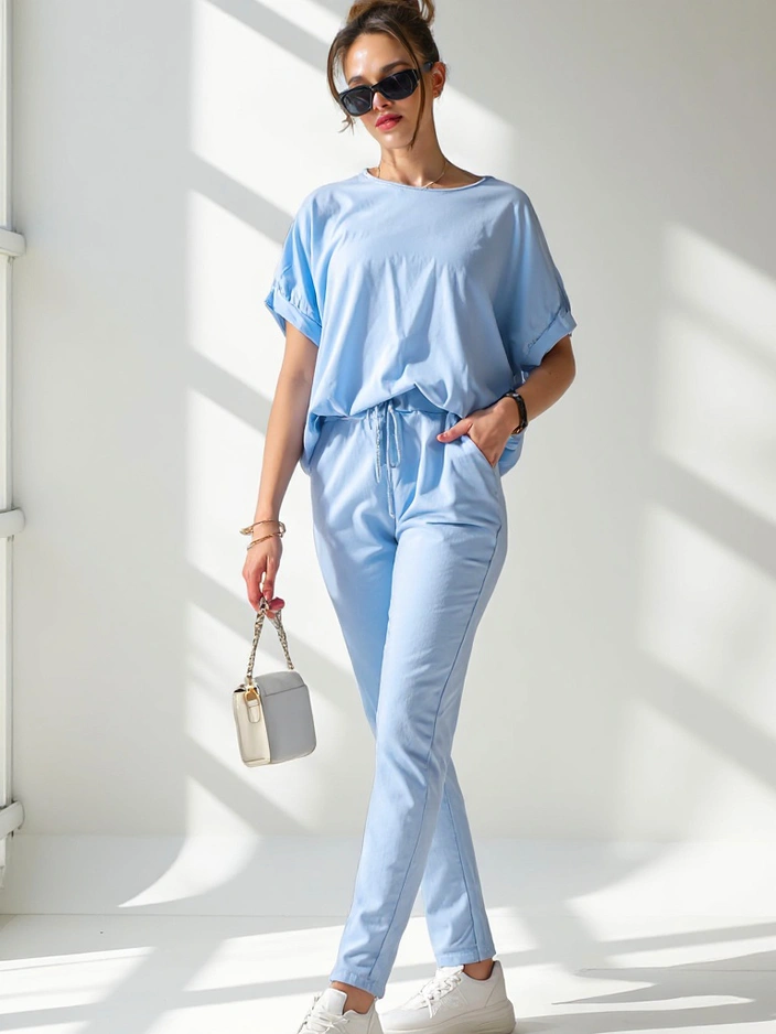 - Жіночий повсякденний комплект, виготовлений з приємної тканини. Блуза тягнеться через голову, має короткі рукави та круглий виріз. Прямі штани з еластичним поясом. Ідеально підходить для тих, хто цінує комфорт.