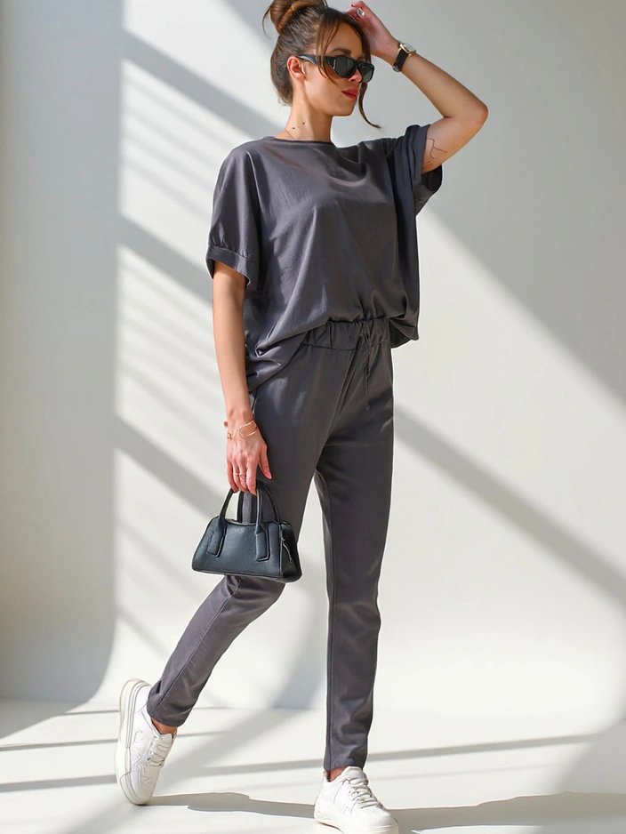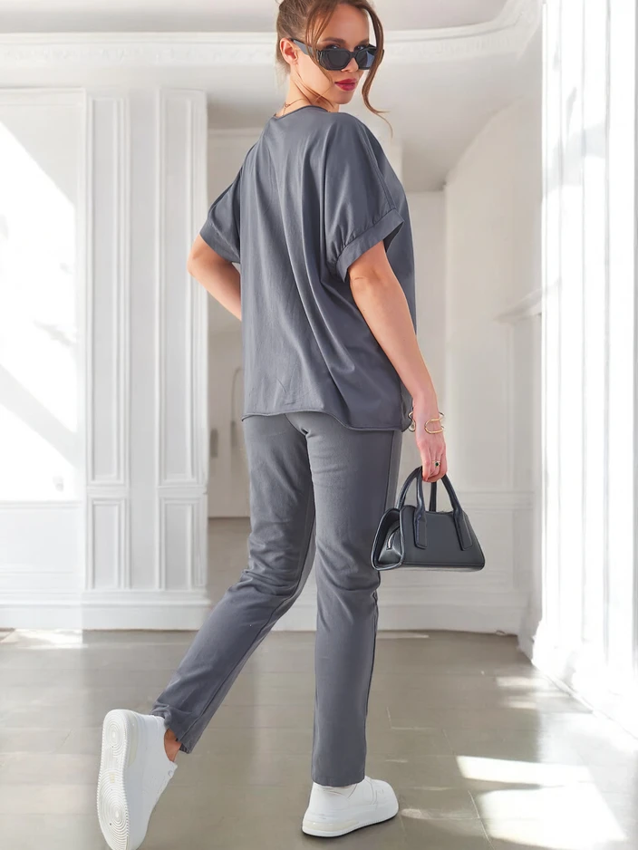 • Жіночий повсякденний комплект, виготовлений з приємної тканини. Блуза тягнеться через голову, має короткі рукави та круглий виріз. Прямі штани з еластичним поясом. Ідеально підходить для тих, хто цінує комфорт.