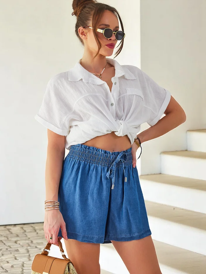 - Легкі жіночі шорти. Модель з високою талією, має два кишені та еластичний пояс. Ідеальний вибір для літа! ЗАУВАЖЕННЯ: Точність вимірювання (+/-) 1 см.