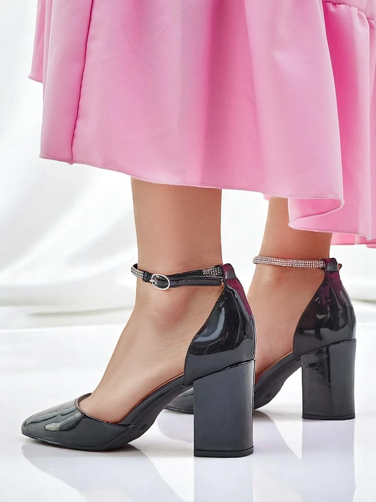 - Елегантні жіночі туфлі на блоці, виготовлені з лакованої еко-шкіри. Всередині взуття підкладка з еко-шкіри, а загострений носок додає елегантності! Крім того, декоративний ремінець з стразами!