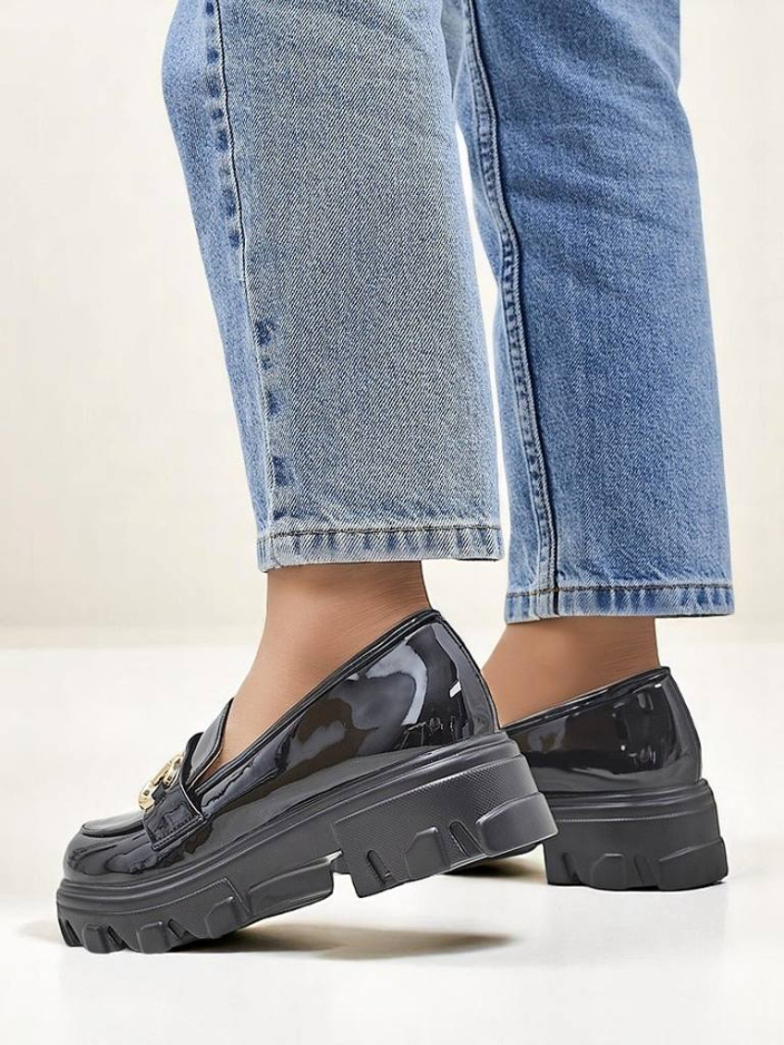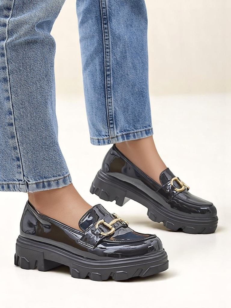 Стильні жіночі лофери з лакованої еко-шкіри в елегантному чорному кольорі. Ця модель вирізняється масивною рельєфною підошвою, яка забезпечує комфорт під час носіння та відмінне зчеплення. Спереду розташована золота прикраса у стилі кінська вуздечка, яка надає взуттю вишуканого характеру. Внутрішня частина оздоблена м’яким матеріалом, що підвищує комфорт під час носіння. Ідеальні як для повсякденних, так і для більш елегантних образів. Чудовий вибір на осінньо-весняний період.