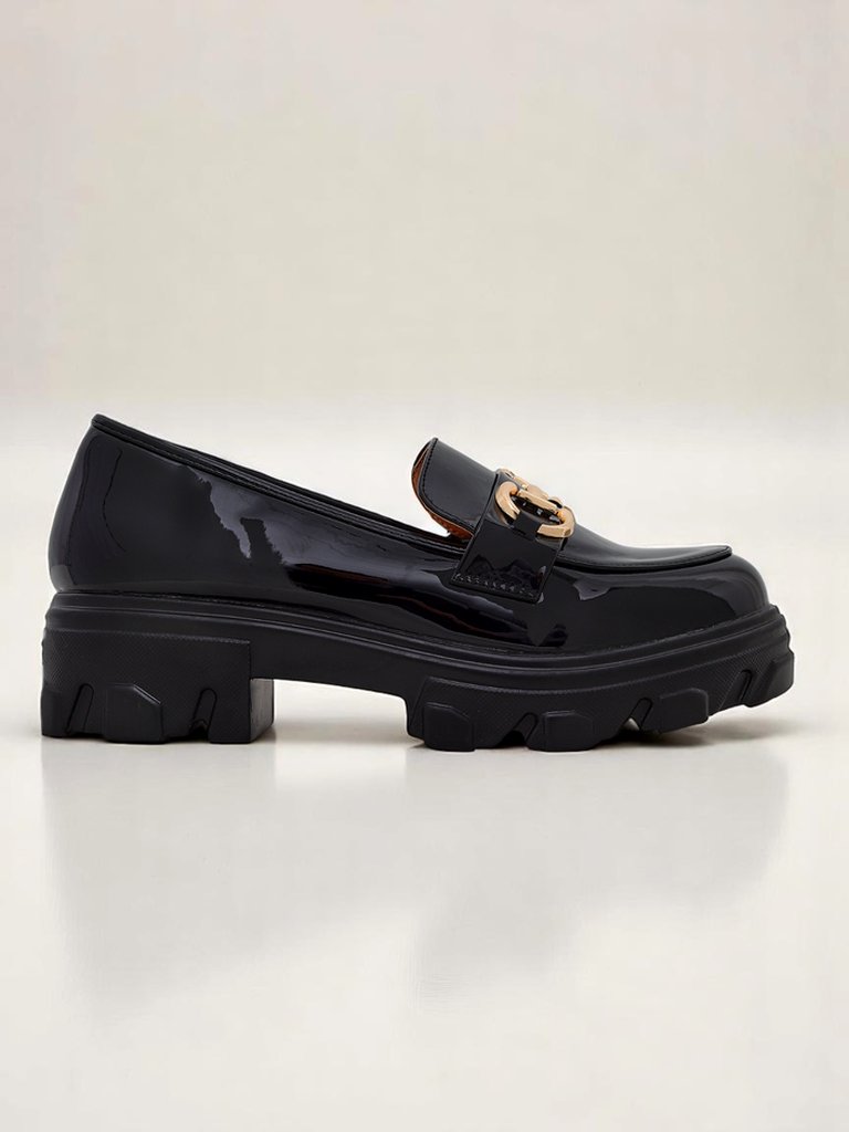 - Лаковані жіночі лофери на товстій підошві з елегантним золотим декором. Ідеальні для щоденного носіння та особливих випадків.