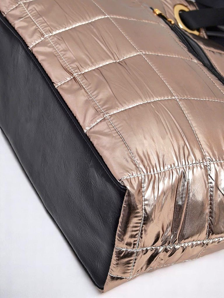 - Сучасна шопер-сумка з екошкіри та голографічної тканини. Стьобана, 1 відділення з роздільником, 5 кишень, знімний ремінь — стиль в русі!