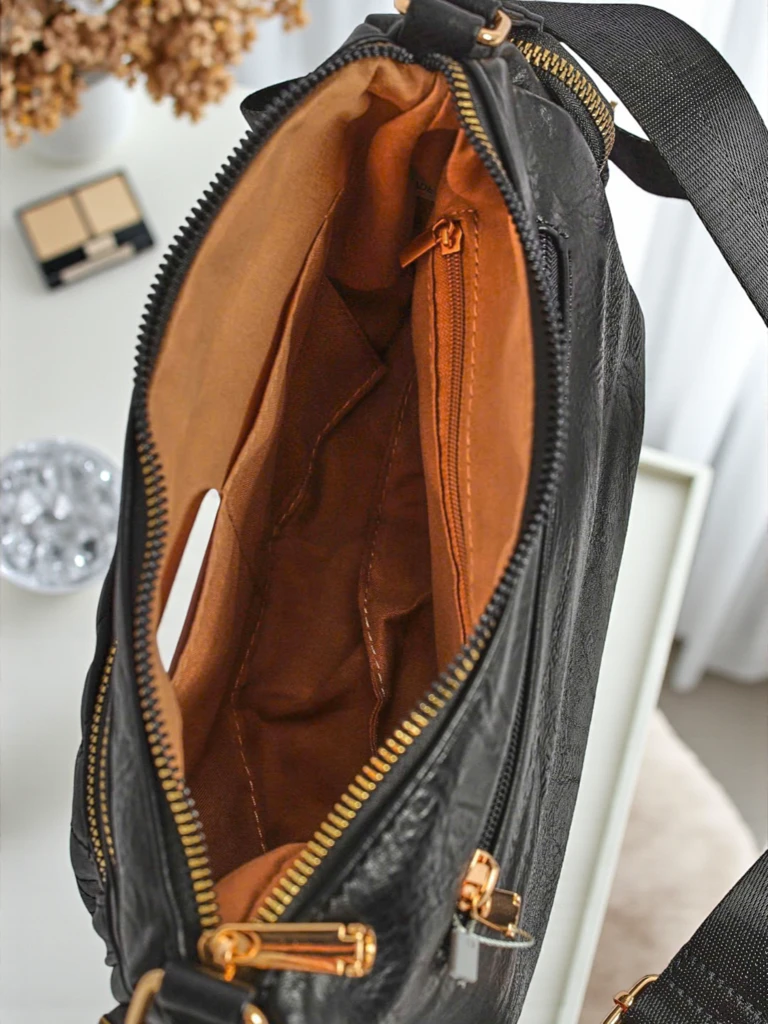 - Це компактна сумочка зі штучної шкіри з простьобаною кишенею. Має 1 відділення, 4 кишені та регульований ремінець. Додатково є 2 бічні кишені. Стильна та практична – ідеальна для щоденного використання та прогулянок.