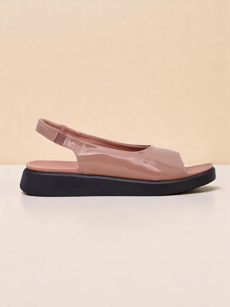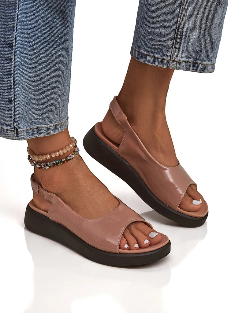 - Стильні сандалі на грубій підошві з блискучої екошкіри. Взуття без застібок поєднує зручність із сучасним виглядом – ідеально підходить для літніх днів і вечорів.