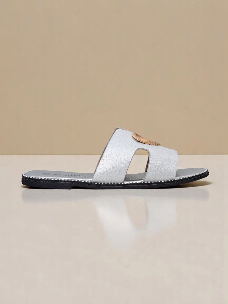 - Шльопанці з екошкіри на плоскій підошві із золотою прикрасою у формі серця. Стиль і комфорт в одному — ідеальні на літо, для прогулянок містом і легких, жіночних образів.