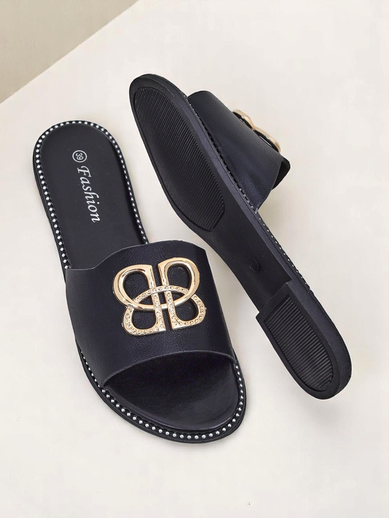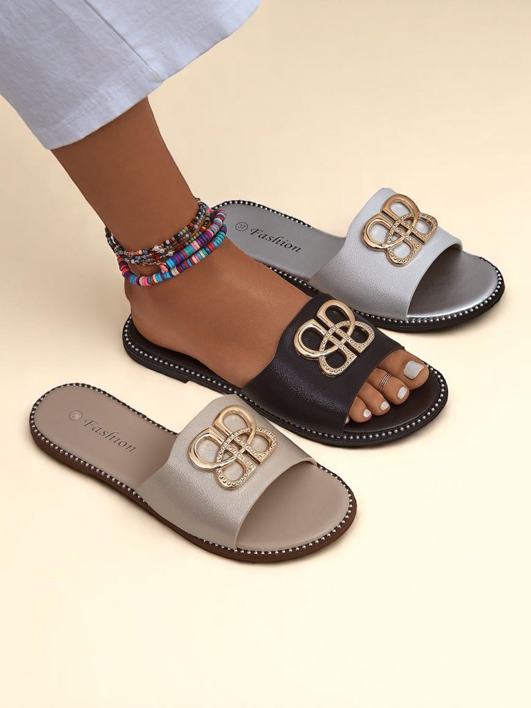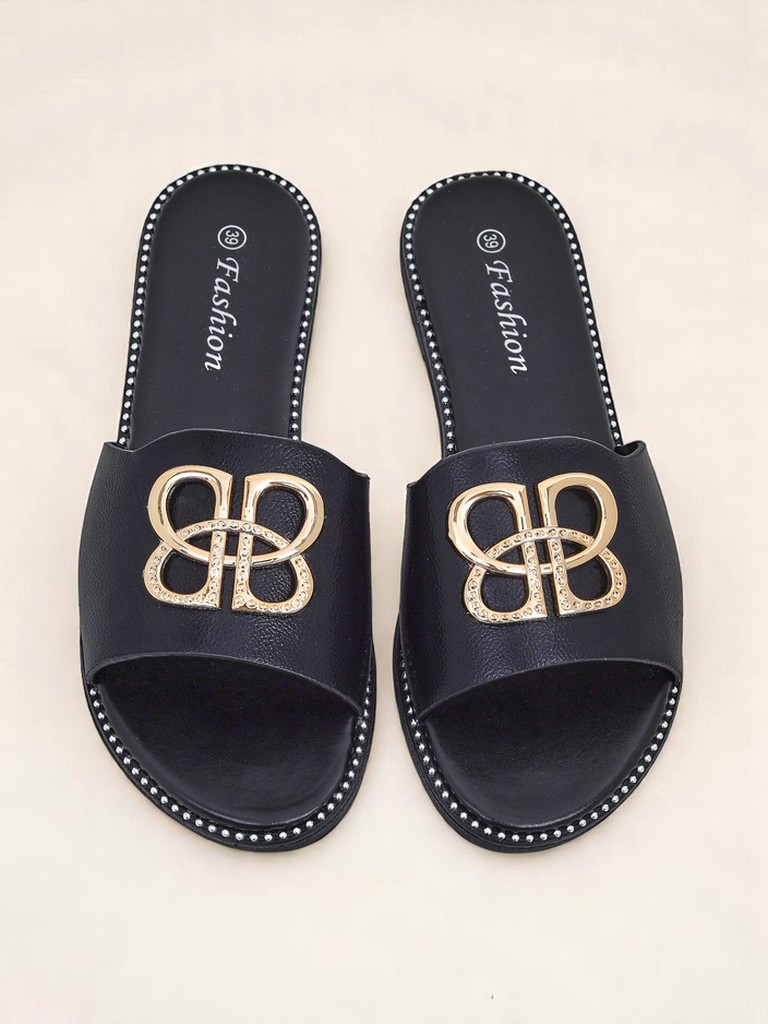 • Стильні шльопанці з екошкіри на плоскій підошві, оздоблені золотою прикрасою. Комфорт і елегантність на кожен день, які додадуть блиску будь-якій літній стилізації.