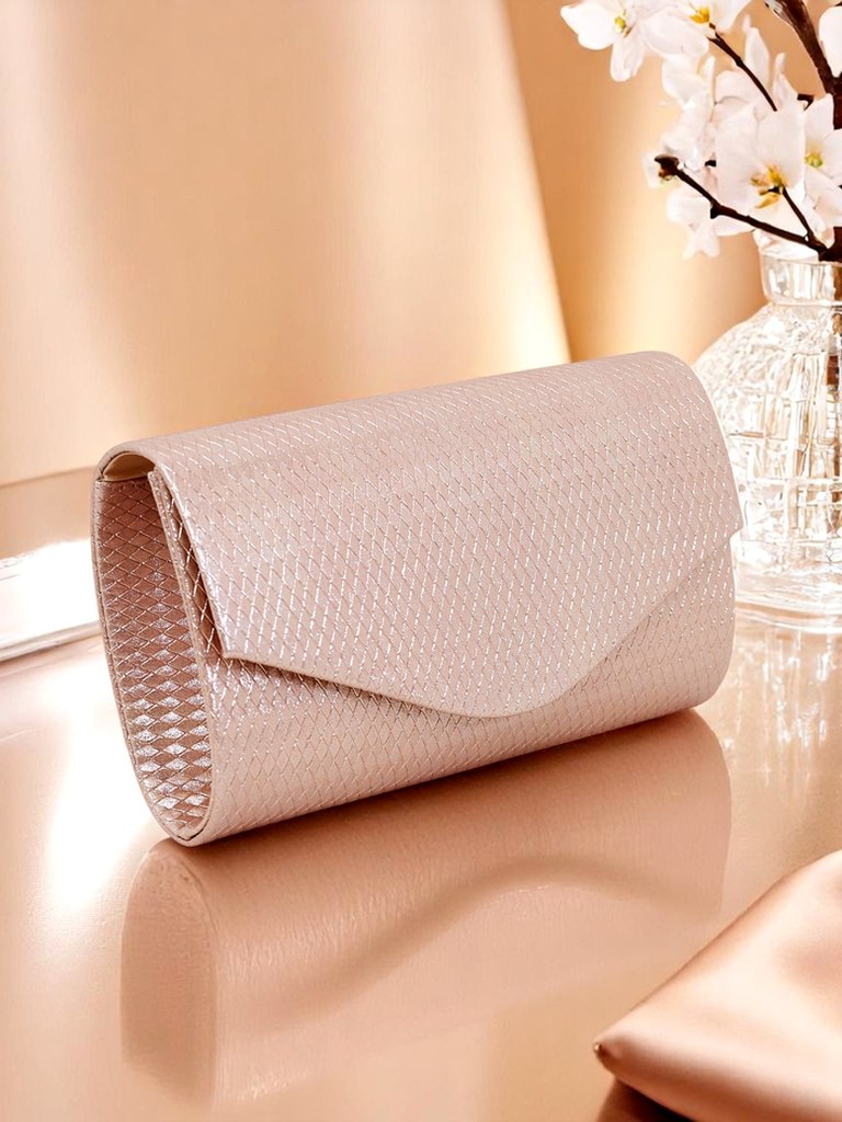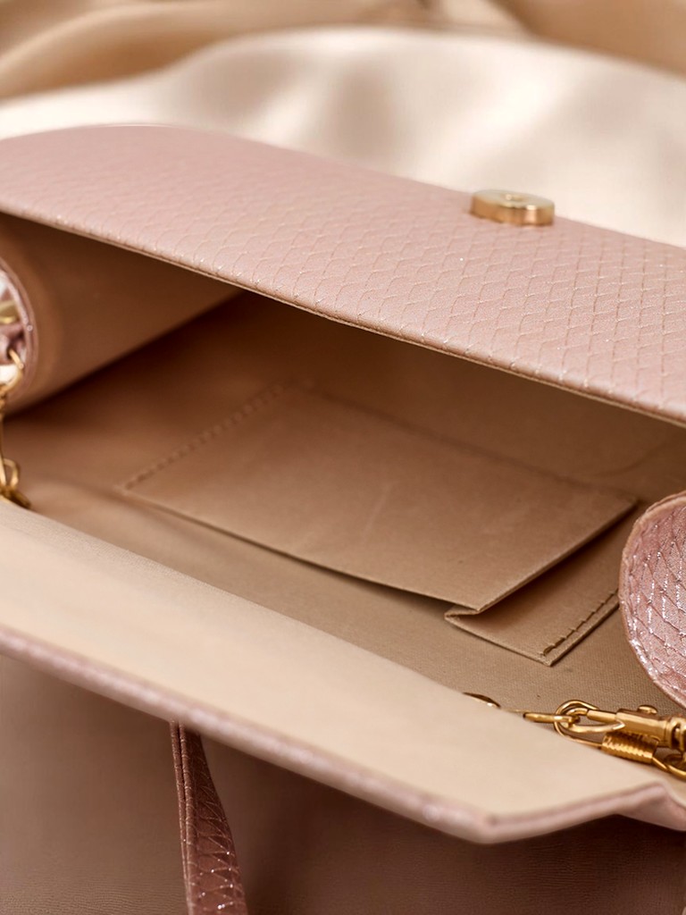 • Сумка-конверт виготовлена з екошкіри, вкрита тканиною з мерехтливою ниткою та делікатним тисненням. Застібається на магніт, з відстібним ремінцем – елегантність у блискучому виконанні.