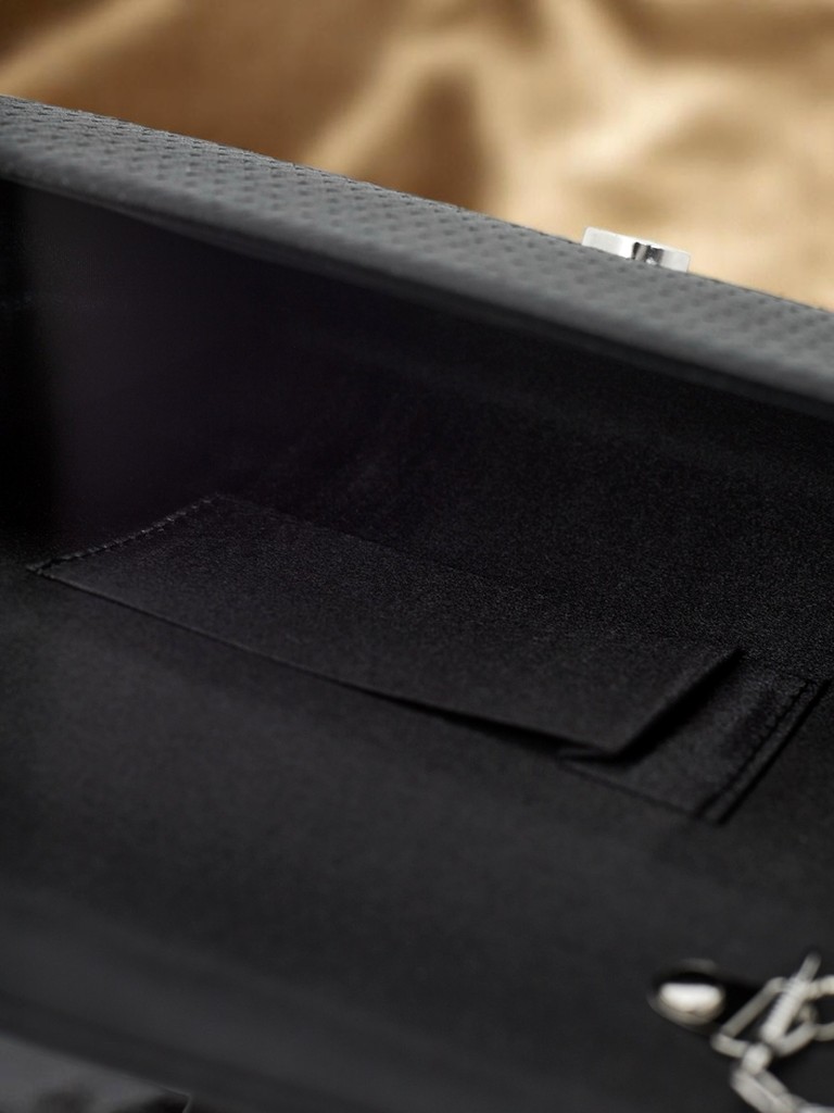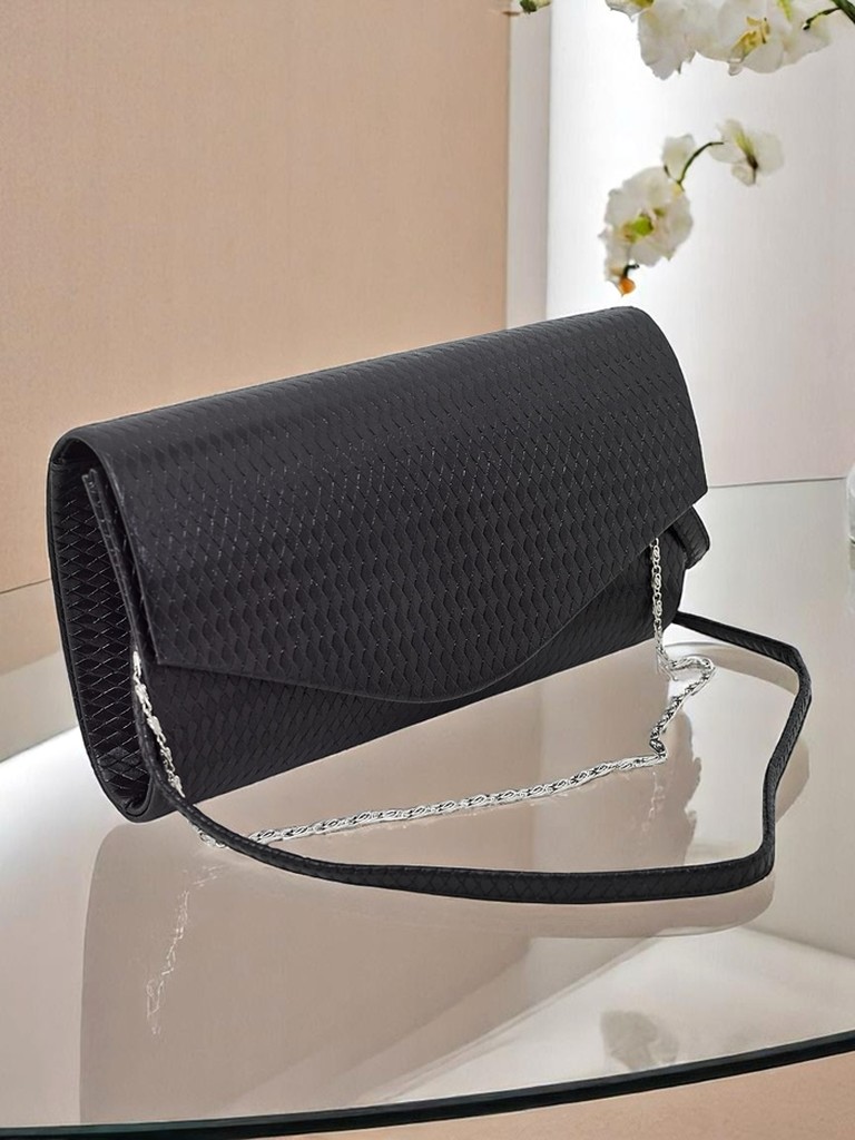 - Сумка-конверт виготовлена з екошкіри, вкрита тканиною з мерехтливою ниткою та делікатним тисненням. Застібається на магніт, з відстібним ремінцем – елегантність у блискучому виконанні.