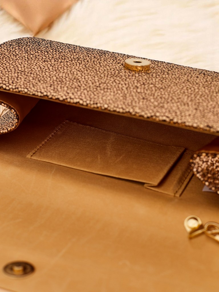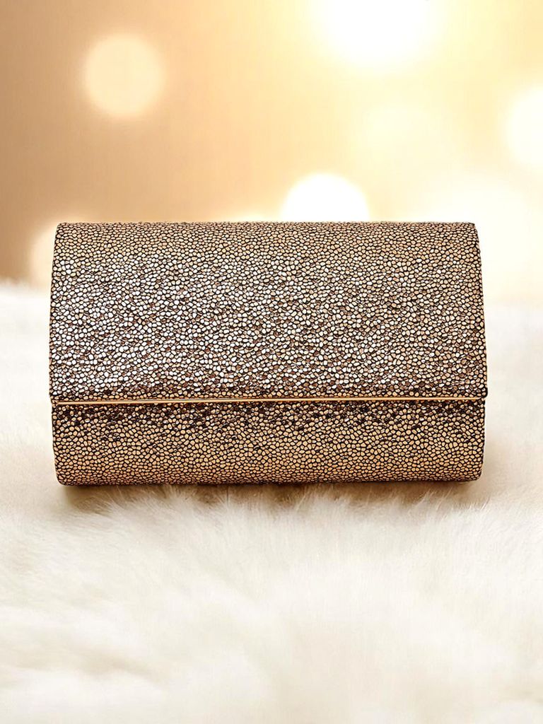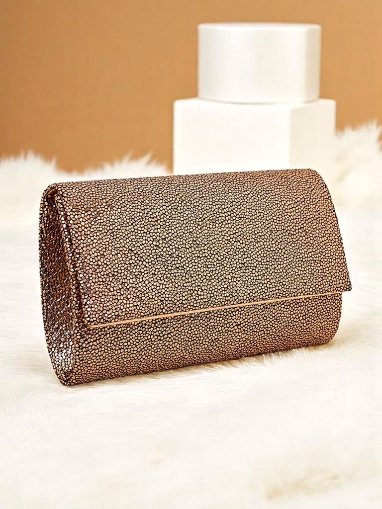- Стильний клатч з еко-шкіри, вкритий щільною блискучою тканиною. Застібається на магніт, знімний ремінець – ідеально підходить для вечірніх виходів і особливих подій.