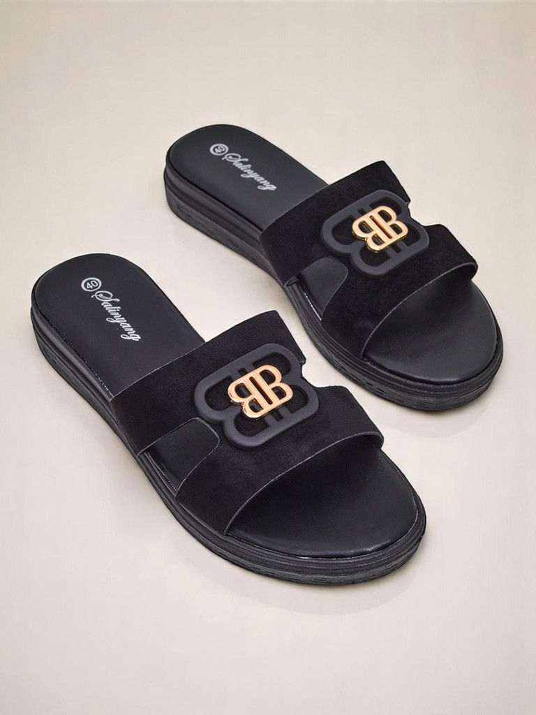 - Стильні, плоскі шльопанці з еко замші з устілкою з еко шкіри. На носку оздоблені елегантною пластиковою аплікацією. Комфорт і шик, ідеальні для літніх днів.