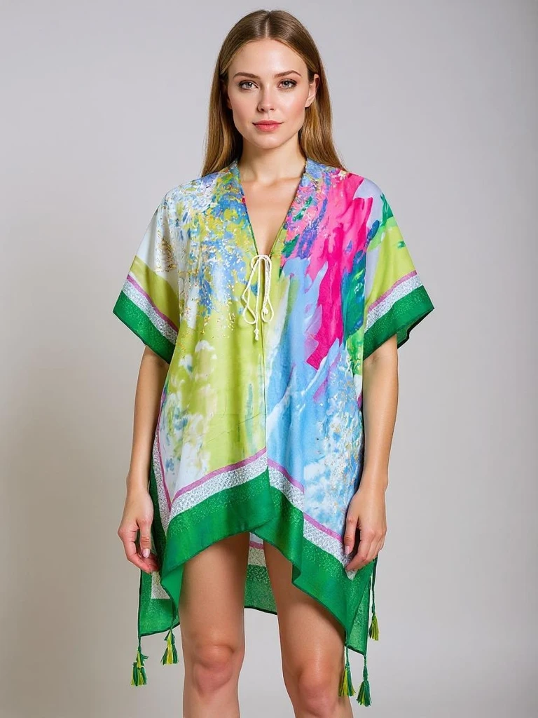 - Літня пляжна туніка типу парео з V-подібним вирізом і асиметричним низом - це стильний must-have для відпустки. Легка, повітряна тканина та ефектний візерунок підкреслюють жіночність, а вільний крій забезпечує комфорт у спекотні дні. Ідеально підходить дл