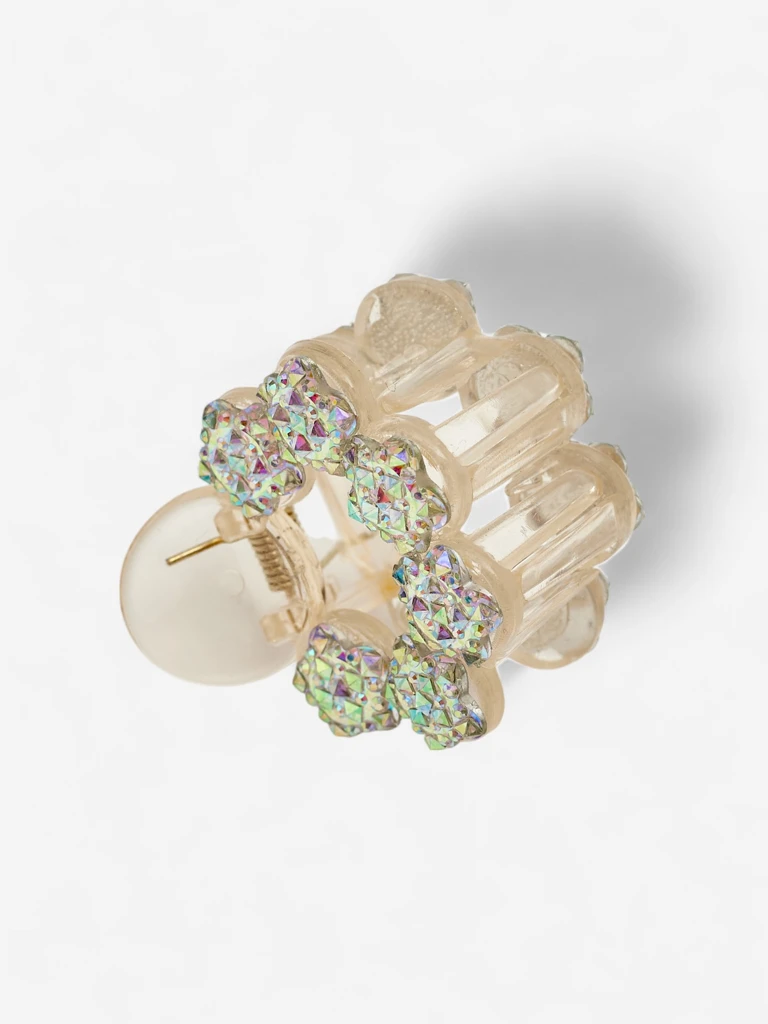 Шпилька для волосся Aurora Flora – це унікальний аксесуар, який захоплює елегантністю та блиском. Виготовлена з високоякісного прозорого пластику (без BPA), має делікатне оздоблення та велику міцність, завдяки чому чудово підійде на кожен день. Оздоблювальну частину створюють квіти, вкриті мерехтливими акриловими кристалами в стилі aurora borealis, які ефектно відбивають світло та привертають увагу. Пружинний механізм дозволяє швидко та надійно зафіксувати зачіску, а міцний хват забезпечує стабільність навіть під час інтенсивних рухів.