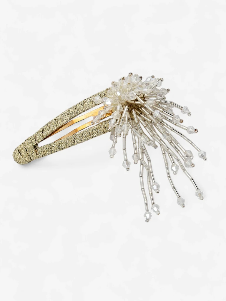 Aurelia Stella – це ексклюзивна шпилька для волосся, натхненна італійською елегантністю та культовою майстерністю. Виготовлена з високоякісного металевого сплаву, покритого шаром, що захищає від потьмяніння, та м'якої тканини букле, яка ледь помітно блищить у світлі. Прикрашена вручну вставленими синтетичними кристалами та скляними намистинами, що створюють ефектну композицію, яка нагадує спалах зірок. Виріб не містить нікелю, що робить його безпечним для чутливої шкіри та ідеальним для тривалого носіння.Шпилька Aurelia Stella є унікальним доповненням до будь-якого образу. Її унікальний візерунок і блиск роблять її ідеальним вибором як для особливих подій, так і для повсякденних образів, що потребують акценту гламуру. Делікатна, але міцна конструкція забезпечує надійне утримання навіть у густому волоссі, не тягнучи його та не викликаючи дискомфорту.Відкрийте для себе три модні способи стилізації:1. Для вечірнього виходу – поєднайте Aurelia Stella з елегантною сукнею максі та витонченими прикрасами, щоб надати всьому образу розкішного характеру.2. В офіс – поєднайте з класичним жакетом і простою зачіскою, наприклад, низьким хвостиком або гладкою зачіскою, додавши трохи шику в повсякденність.3. На кожен день – прикріпіть її до вільно розпущених хвиль або легкої коси, щоб підкреслити свій індивідуальний стиль і слідувати останнім тенденціям.Консервація та догляд: обережно очищайте шпильку вологою тканиною. Зберігайте її в окремому тканинному мішечку, щоб уникнути подряпин і сплутування з іншими прикрасами. Уникайте контакту з водою, парфумами та хімікатами, що дозволить зберегти її блиск надовго.Aurelia Stella відображає гарячі тенденції сезону: перли, кристали та мотиви, натхненні небом, зараз панують на подіумах і серед fashionista по всьому світу. Ця шпилька чудово доповнить будь-який образ, поєднуючи в собі сучасність і витончену класику.