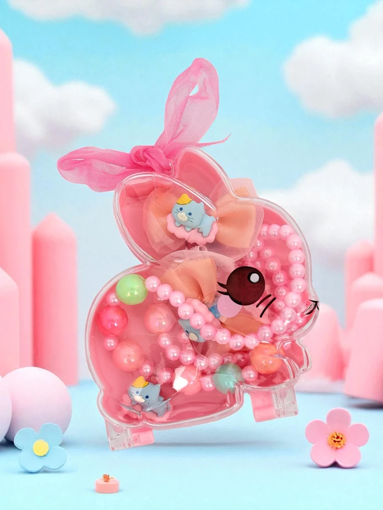 - Яскравий дитячий набір біжутерії Bambina Allegra – намисто, браслет і шпильки для волосся у чарівному футлярі у вигляді зайчика.
