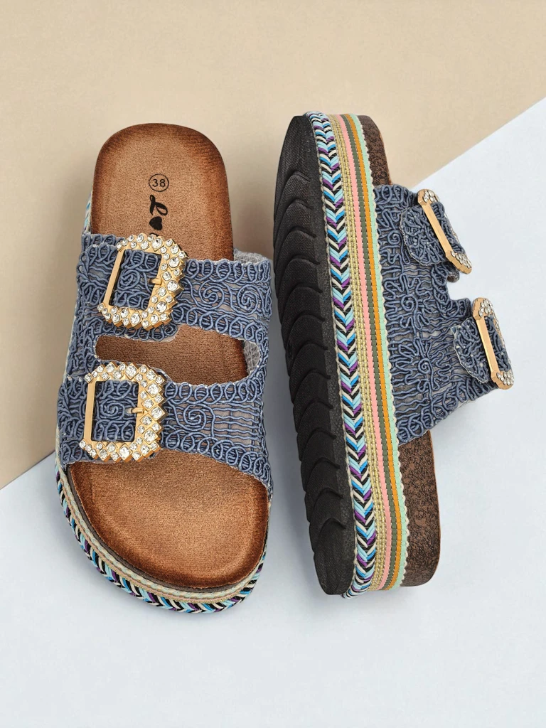 - Стильні мюлі на платформі з підошвою під пробку, з плетеними текстильними ремінцями, оздобленими пряжками зі стразами. Комфортна устілка з еко-замші забезпечує зручність, а блискучі деталі додають елегантності літньому образу.