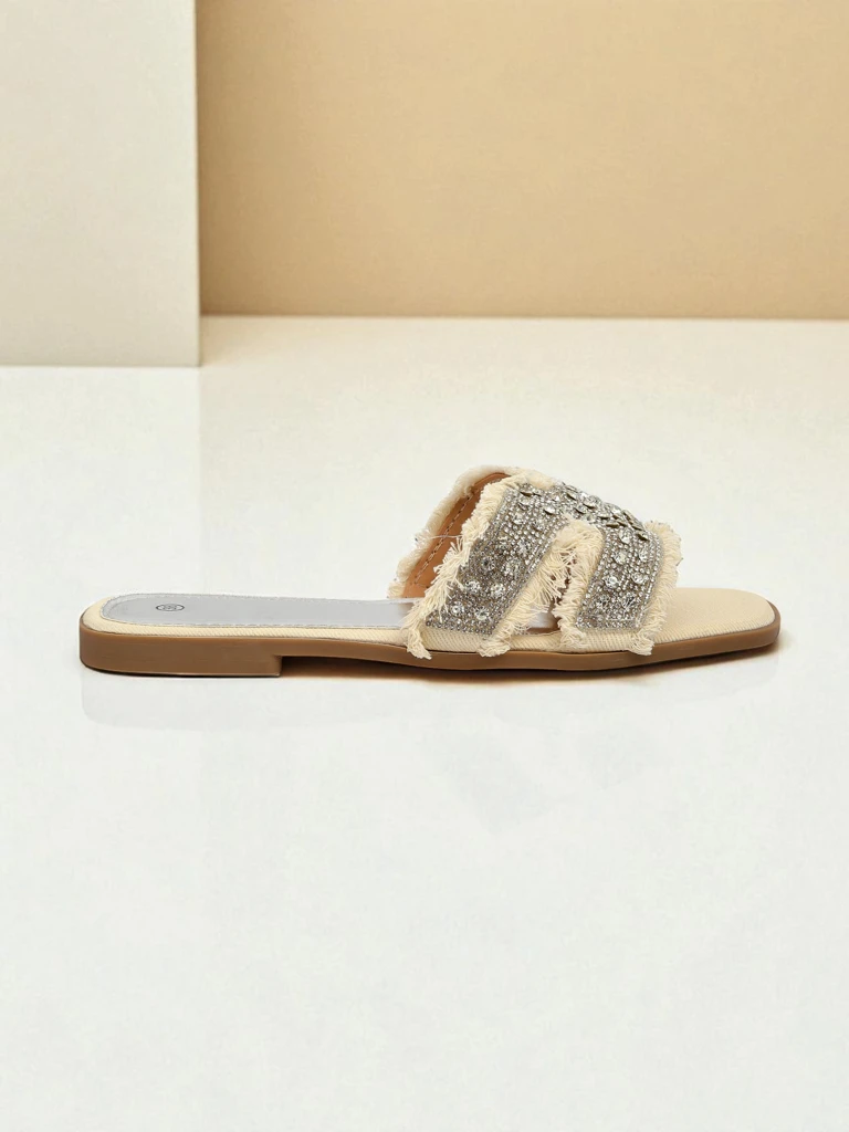 - Плоскі жіночі капці з екошкіри, прикрашені сяючими стразами. Стильні та зручні, ідеально підходять для літа та особливих подій. Вони додають блиску будь-якому образу та забезпечують комфорт протягом усього дня.