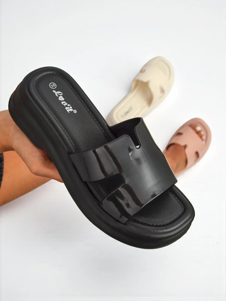 • Жіночі шльопанці на товстій підошві, з устілкою з екологічної шкіри та ремінцем з лакованої гуми. Сучасний стиль і комфорт в одному – ідеальні для літніх, міських стилізацій.