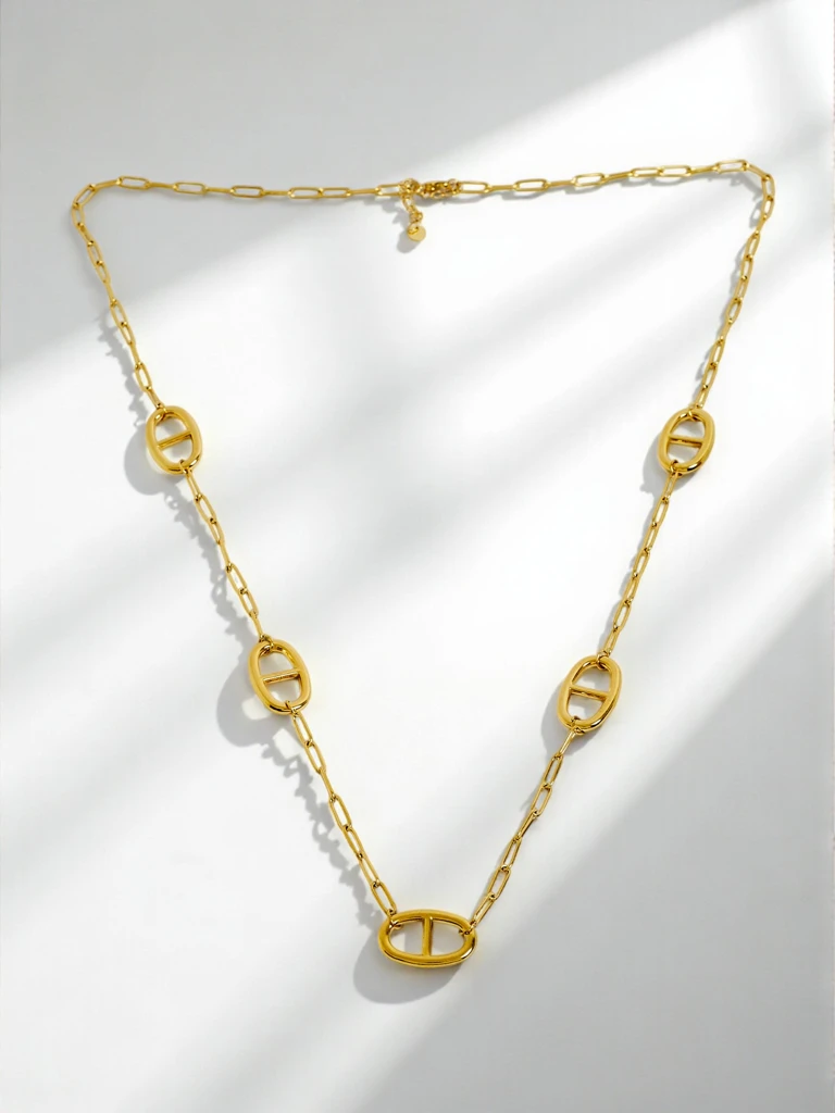 Ланки еліптичної форми натхненні геометричними мотивами античної епохи, що надає намисту неповторного, нешаблонного характеру. Кожен елемент ретельно відполірований, щоб підкреслити винятковий блиск і довговічність прикраси.