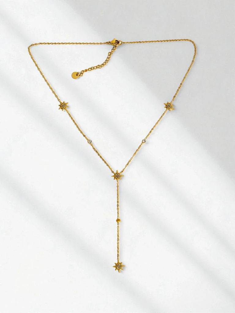 - Делікатний кольє-ларіат з нержавіючої сталі, позолочений, з мотивом зірок – модна біжутерія на будь-який випадок.