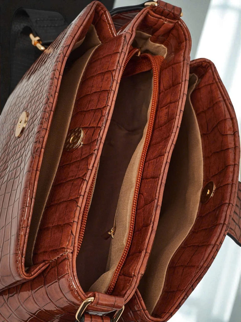 - Квадратна сумочка з лакованої екошкіри з тисненням. 1 відділення, 3 кишеньки, замок, магніт та регульований ремінець. Стиль і функціональність у досконалому виконанні.