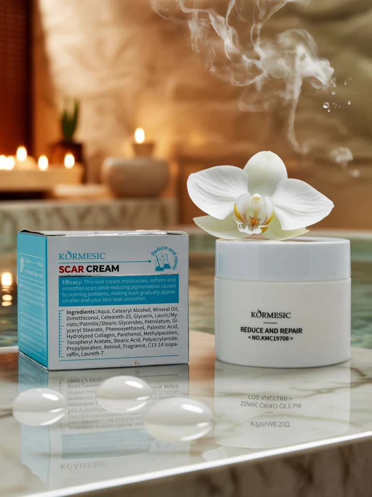 - Крем від шрамів сприяє регенерації шкіри, зменшує видимість шрамів і вирівнює її структуру, роблячи шкіру більш гладкою, м'якою та однорідною на вигляд.
